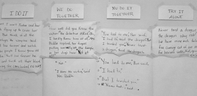 Many students aren’t sure how to properly format dialogue. They know how to punctuate generally and where to put the quotation marks, but they haven’t practiced indenting and often have questions about when to use commas and when to capitalize. One teaching technique that works well to help students strengthen this skill is I Do, We Do, You Do.